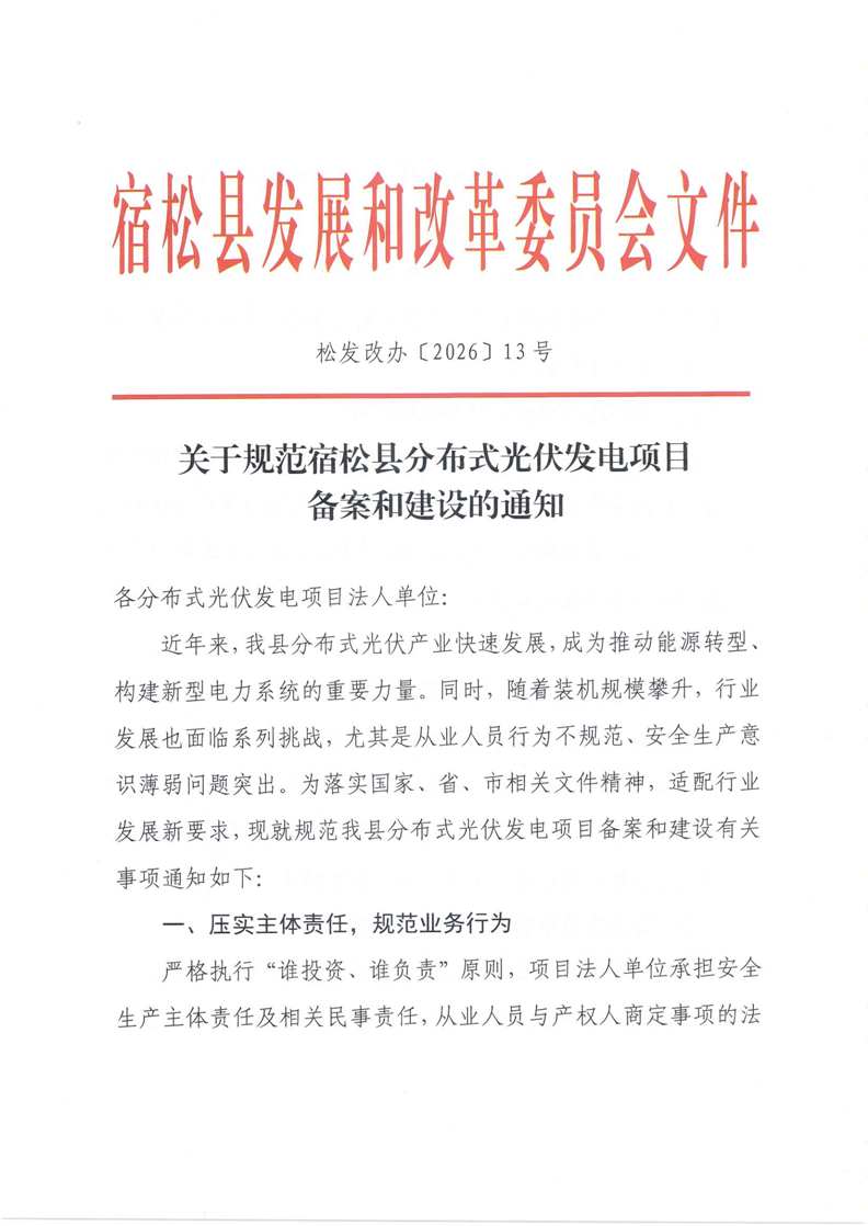 2月24日,安徽省宿松县发改委印发《关于规范宿松县分布式光伏发电项目备案和建设的通知》,通知要求,严格执行“谁投资、谁负责”原则,项目法人单位承担安全生产主体责任及相关民事责任,从业人员与产权人商定事项的法律责任、义务由授权企业全额承担。从业人员开展合作洽谈、产权证明办理等业务时,须主动出示企业相关证明、佩戴有效工作证件;未提供有效身份证明导致业务延误的,责任由项目法人单位自行承担。企业接受未授权人员开展业务的,视为自愿承担该业务所产生的全部责任。