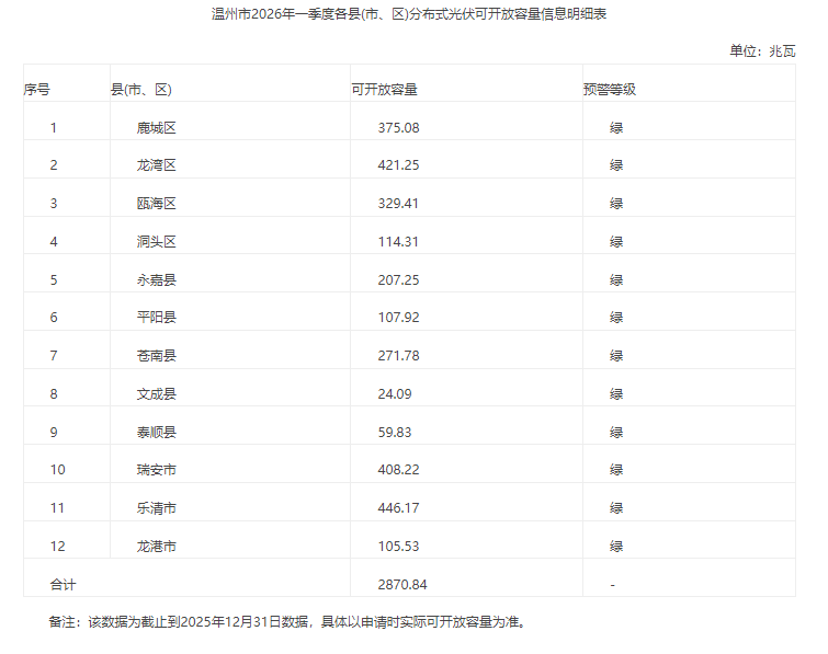 3月26日,温州市发改委发布公告,对温州市2026年一季度分布式光伏可开放容量进行公示。公告显示,温州市2026年一季度各县(市、区)分布式光伏可开放容量合计2870.84MW,预警等级均为绿色。具体情况如下: