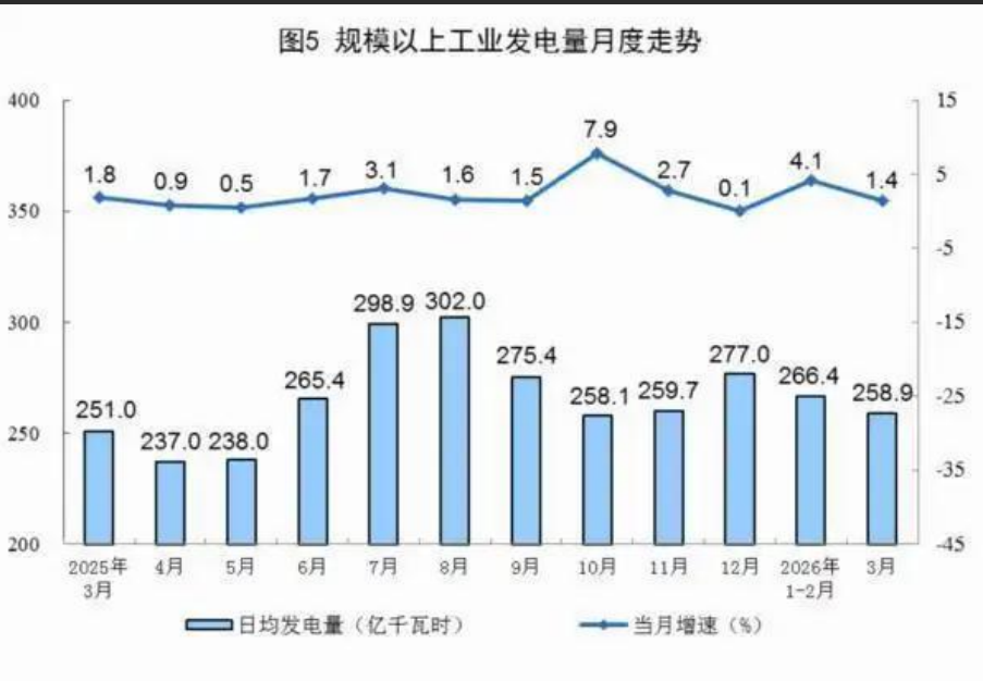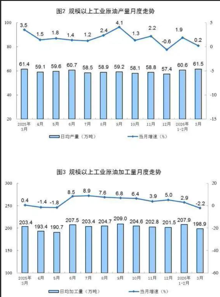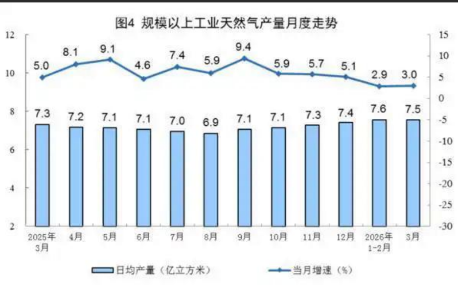 4月16日,据国家统计局数据,3月份,规模以上工业(以下简称规上工业)原煤生产规模稳定,原油生产保持增长,天然气生产增速加快,电力生产稳定增长。 一、原煤、原油和天然气生产及相关情况 原煤生产规模稳定。3月份,规上工业原煤产量4.4亿吨,同比持平;日均产量1421万吨。 1—3月份,规上工业原煤产量12.0亿吨,同比增长0.1%。 ![]() 原油生产保持增长。3月份,规上工业原油产量1907万吨,同比增长0.2%;日均产量61.5万吨。 1—3月份,规上工业原油产量5480万吨,同比增长1.3%。 原油加工由增转降。3月份,规上工业原油加工量6167万吨,同比下降2.2%;日均加工198.9万吨。 1—3月份,规上工业加工原油18431万吨,同比增长1.1%。 ![]() 天然气生产增速加快。3月份,规上工业天然气产量234亿立方米,同比增长3.0%,增速比1—2月份加快0.1个百分点;日均产量7.5亿立方米。 1—3月份,规上工业天然气产量681亿立方米,同比增长3.0%。 ![]() 二、电力生产情况 规上工业电力生产稳定增长。3月份,规上工业发电量8025亿千瓦时,同比增长1.4%,增速比1—2月份回落2.7个百分点;日均发电258.9亿千瓦时。1—3月份,规上工业发电量23782亿千瓦时,同比增长3.4%。 分品种看,3月份,规上工业火电、水电、太阳能发电增速加快,核电、风电由增转降。其中,规上工业火电同比增长4.2%,增速比1—2月份加快0.9个百分点;规上工业水电增长10.8%,增速加快4.0个百分点;规上工业核电下降11.8%,1—2月份为增长0.8%;规上工业风电下降17.3%,1—2月份为增长5.3%;规上工业太阳能发电增长10.0%,增速比1—2月份加快0.1个百分点。 ![]() |