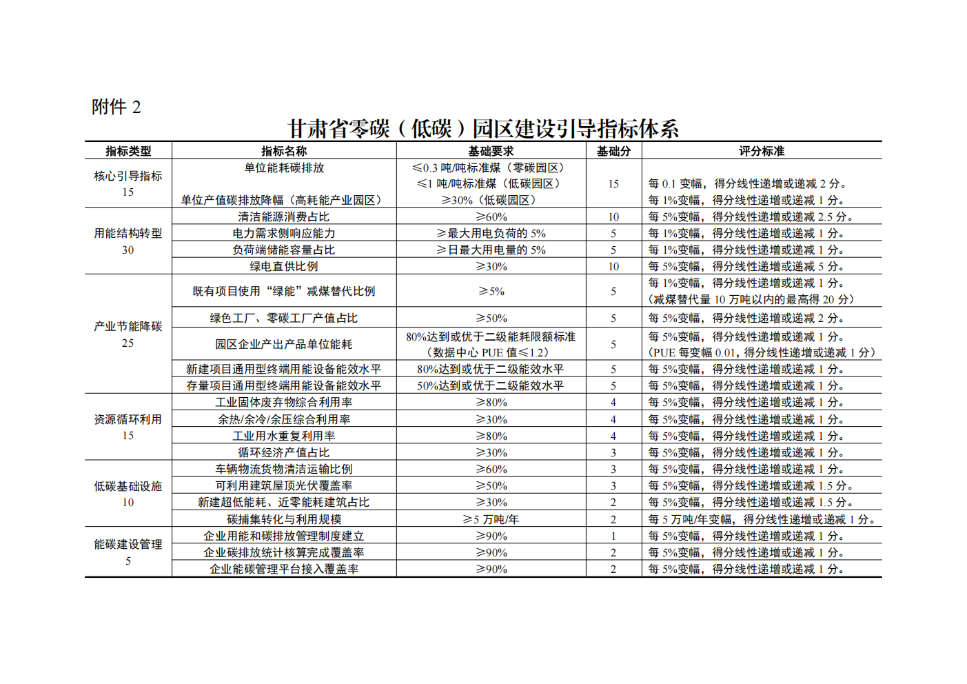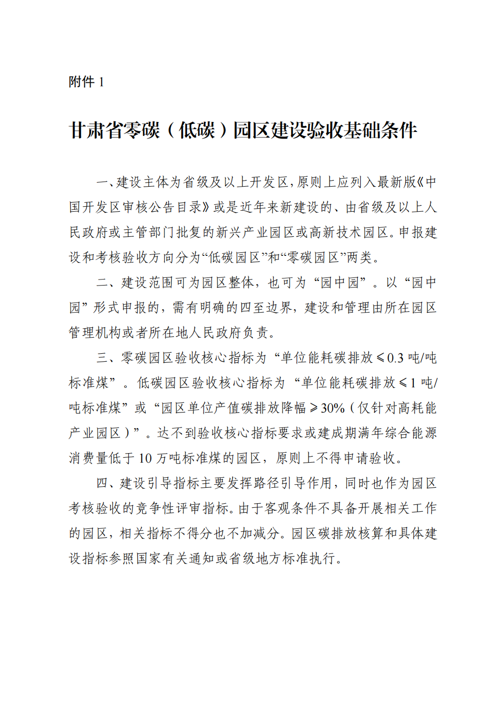 四、组织实施 (一)加强统筹协调。 省发展改革委牵头加强统筹协调,会同省直有关部门持续推动政策创新和制度建设,动态优化相关指标体系。省工业和信息化厅指导各地推进工业园区低碳化改造,支持具备条件的企业打造“零碳工厂”。省能源局指导各地加强园区绿色能源供给体系建设。省直各相关部门和市州要强化协同配合,在政策落地、改革试点、项目建设、资金安排等方面给予零碳园区建设积极支持。 (二)组织园区申报。 各市州要深入分析辖区内园区基础条件、发展路径和降碳潜力,形成辖区内园区低碳化、零碳化梯度建设清单并动态调整。各市州发展改革委会同工信、能源等主管部门推荐有条件、有意愿的园区申报建设省级零碳(低碳)园区,参照国家级零碳园区申报大纲编制省级零碳(低碳)园区建设方案,明确建设方向和目标任务。省级建设名单实行动态征集调整更新。 (三)抓好落实推进。 按照“市级自主创建、省级论证考核”的程序,各市州发展改革委会同本地相关部门建立健全工作机制,扎实推进有关园区实施低碳化、零碳化建设。省发展改革委协同工信、能源等部门组织全省各类园区加强“条线”谋划申报项目,统筹做好园区用能结构转型、减污降碳协同增效、产业“三化”改造、节能降碳改造等中央资金支持领域的项目储备和资金争取工作,同步推进省预算内基建资金支持省级零碳园区建设重点项目。 (四)强化总结推广。 州发展改革委要会同有关方面,及时协调解决园区建设过程中遇到的困难和问题,动态掌握建设进展,系统总结典型经验和有效做法,定期报送省直相关部门,探索推广符合本省实际的园区低碳化、零碳化发展路径。 附件:1.甘肃省零碳(低碳)园区建设验收基础条件 ![]() 2.甘肃省零碳(低碳)园区建设引导指标体系 ![]() |