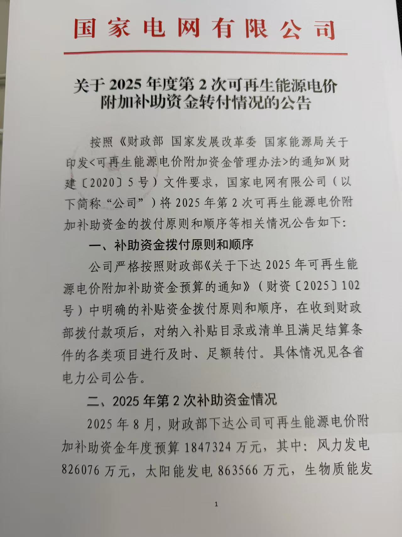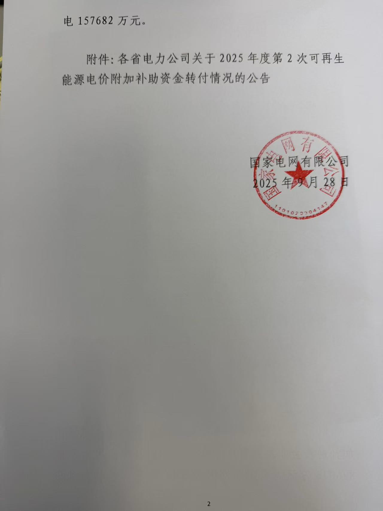 9月26日国家电网发布2025年度第2次可再生能源电价附加补助资金转付情况的公告。
