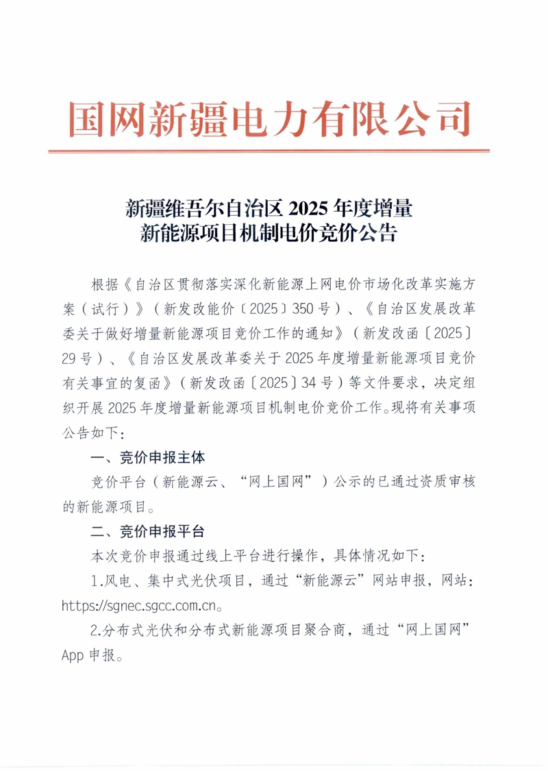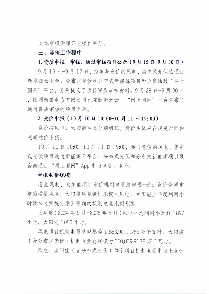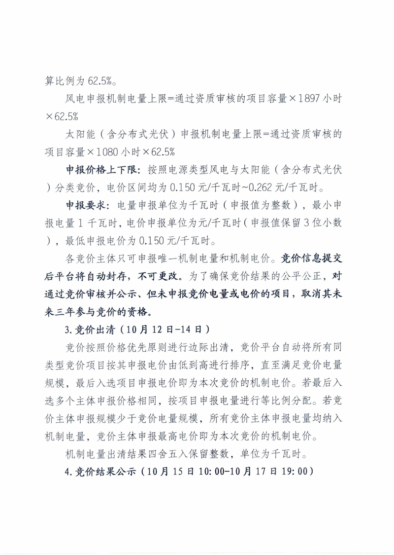 9月30日,新疆国网发布2025年度增量新能源项目机制电价竞价公告。 根据公告,9月15日-9月30日进行资质申报、审核、通过审核项目公示。 10月10日10:00开始竞价申报,竞价按风电、太阳能两类分别组织。竞价主体应在规定时间内完成竞价申报。 申报电量规模的计算方式,增量风电、太阳能项目竞价机制电量总规模=通过竞价资质审核的增量风电、太阳能项目装机规模x风电、太阳能上年度利用小时数x《实施方案》明确的机制电量比例 50%。 上年度(2024年9月-2025年8月)风电平均利用小时数1897小时,太阳能1080小时。 风电项目机制电量总规模为1,853,921.9755万千瓦时、太阳能(含分布式光伏)机制电量总规模为360,839.9178万千瓦时。 风电、太阳能(含分布式光伏)单个项目机制电量申报上限计算比例为 62.5%。 风电申报机制电量上限=通过资质审核的项目容量x1897小时 x62.5% 太阳能(含分布式光伏)申报机制电量上限=通过资质审核的项目容量X1080小时x62.5% 申报价格上下限:按照电源类型风电与太阳能(含分布式光伏)分类竞价,电价区间均为0.150元/千瓦时~0.262元/千瓦时。 申报要求:电量申报单位为千瓦时(申报值为整数),最小申报电量1千瓦时,电价申报单位为元/千瓦时(申报值保留3位小数),最低申报电价为0.150元/千瓦时。 各竞价主体只可申报唯一机制电量和机制电价。竞价信息提交后平台将自动封存,不可更改。为了确保竞价结果的公平公正,对通过竞价审核并公示、但未申报竞价电量或电价的项目,取消其未来三年参与竞价的资格。 10月12日-14日,竞价出清。竞价按照价格优先原则进行边际出清,竞价平台自动将所有同类型竞价项目按其申报电价由低到高进行排序,直至满足竞价电量规模,最后入选项目申报电价即为本次竞价的机制电价。若最后入选多个主体申报价格相同,按项目申报电量进行等比例分配。若竞价主体申报规模少于竞价电量规模,所有竞价主体申报电量均纳入机制电量,竞价主体申报最高电价即为本次竞价的机制电价。 10月15日10:00-10月17 日19:00进行竞价结果公示。 全文如下: ![]() ![]() ![]() ![]() ![]() |