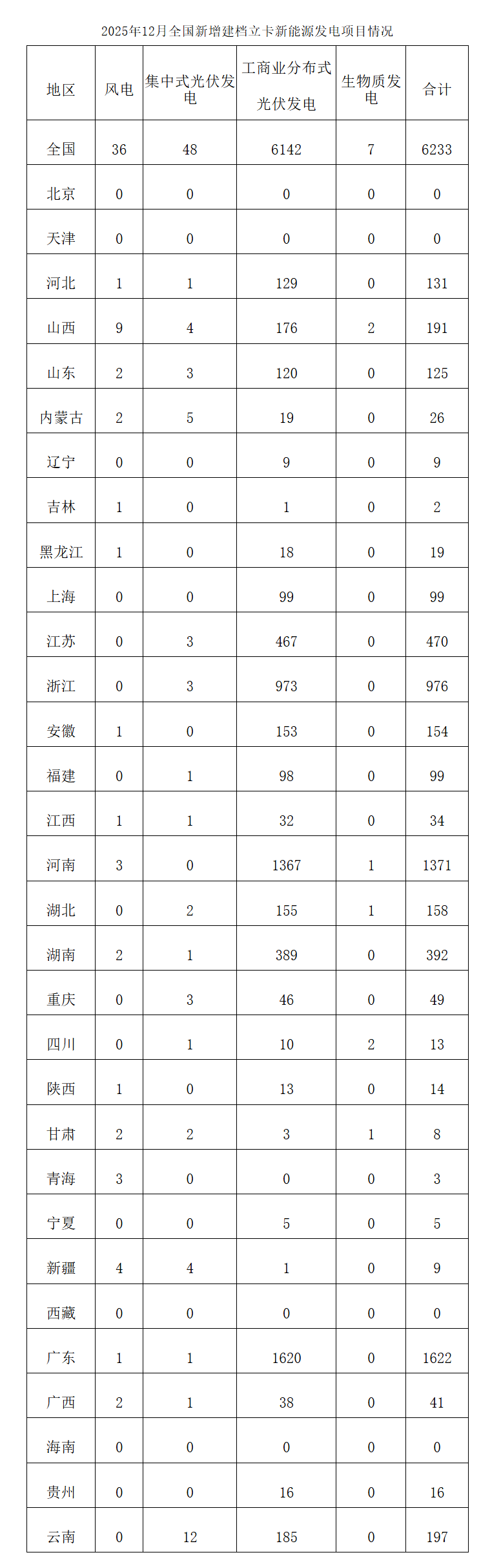 2月3日,国家能源局发布2025年12月全国新增建档立卡新能源发电(不含户用光伏)项目情况。 2025年12月,全国新增建档立卡新能源发电(不含户用光伏)项目共6233个,其中风电项目36个,光伏发电项目6190个(集中式光伏发电项目48个,工商业分布式光伏发电项目6142个),生物质发电项目7个。风电、集中式光伏发电、生物质发电项目清单见附件,工商业分布式光伏发电项目清单详见国家可再生能源发电项目信息管理平台网站(网址https://jdlk.renewable.org.cn/card-info-sheet/)。 ![]() |