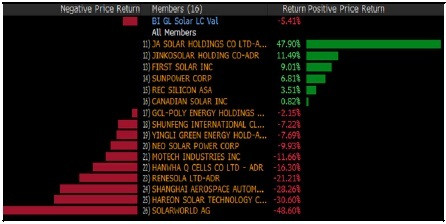 2017年,Bloomberg Intelligence 旗下研究的全球大型太阳能标杆企业指数下挫5.3%,逊于同期上涨8.5%的MSCI 全球市场指数(MSCI ACWI Index)。德国太阳能制造商 SolarWorld 在 2017 年 5 月申请了破产、太阳能电池板价格下跌,同时美国住宅用太阳能增长缓慢、管线项目减少,这些因素都可能打击业内情绪。此外一些影响可能持续2017年全年:中美贸易关系一直紧张;中国十三五规划的增长目标也出现走低趋势;内需增长放缓对中国设备生产商构成压力。
