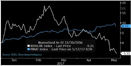 继2016年大跌52%之后,2017年年初以来,BI 旗下行业研究的太阳能标杆企业相关股指下跌5%。市场情绪可能已经因为中美两国贸易关系紧张(欧盟将对中国制造太阳能电池板的反倾销关税延长了18个月)、国际油价下跌、SolarWorld申请破产(2017年年内股价重挫49%)而进一步恶化。First Solar和SunPower(2017年股价分别涨9%和7%)这类美国太阳能企业削减成本的努力可能缓和市场对降价压力和行业产能过剩的担忧。