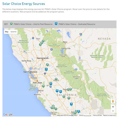 图3:显示正在PG&E服务范围内开发和规划的光伏电站的地图。蓝色方块是为“Solar Choice方案”开发的百万光伏电站的位置(出处:PG&E)