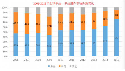 保利协鑫系列高效多晶硅片以高转化率和高性价比进一步压制了单晶硅片市场空间,造成2015年全球单晶产品占比大幅度下滑到20%以下。高效多晶硅片的提效降本增产扩销,贡献了主要业绩。