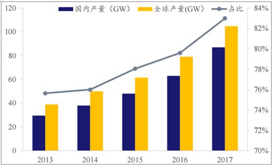 2017年我国硅片产量188亿片,折合产量87.6GW,同比大幅增长39%。2017年全球硅片出货量105.5GW,国内产量占比83%,全球绝对领先。