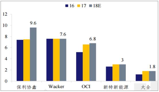 2016-2018年前5大硅料企业产能:万吨