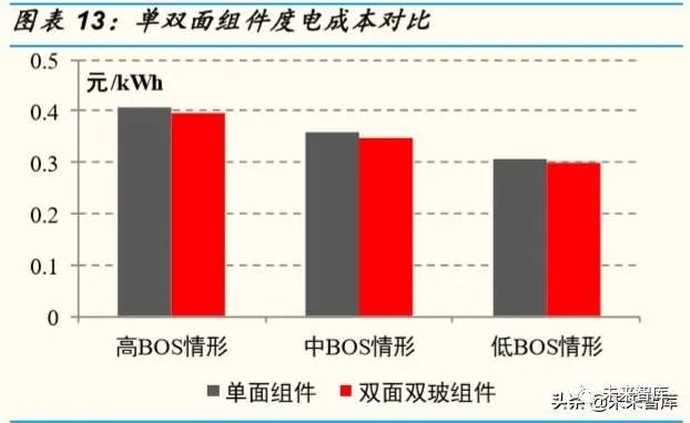 1)双面发电组件在不同场景下的发电量增益差距较大,度电成本优势 也需根据项目情况详细测算,其价值难以直观、统一、标准化地衡量;