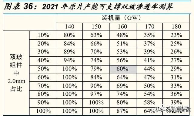 我们测算 2020/2021 年光伏玻璃原片有效日熔量(即供给)增速 20%左右, 中性预期下可支撑双玻渗透率提升至 68%/60%(装机量 130/160GW,双 玻组件中 2.0mm 占比 50%),若 2.0mm 双玻占比加速提升,则该数据还 可进一步提升。