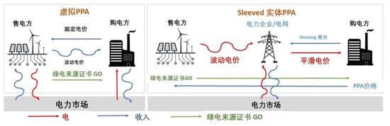 PPA即长期购电协议,企业与独立的电力生产商、公用事业公司或金融公司签署协议,在约定期限内以固定价格承诺购买一定数量的可再生能源电力。大的工业用户也会签一些直接购电协议,以锁定长期电价,规避风险,同时保证了绿色电力消费。实际中,PPA的种类有很多,可以分为实体PPA(Sleeved or physical PPA) 和虚拟PPA(Synthetic or virtual PPA)。合同条款包括如合同期、电量、电价、绿证价格、交割期、交割点等,成为买卖双方电力购售和银行融资的基础。