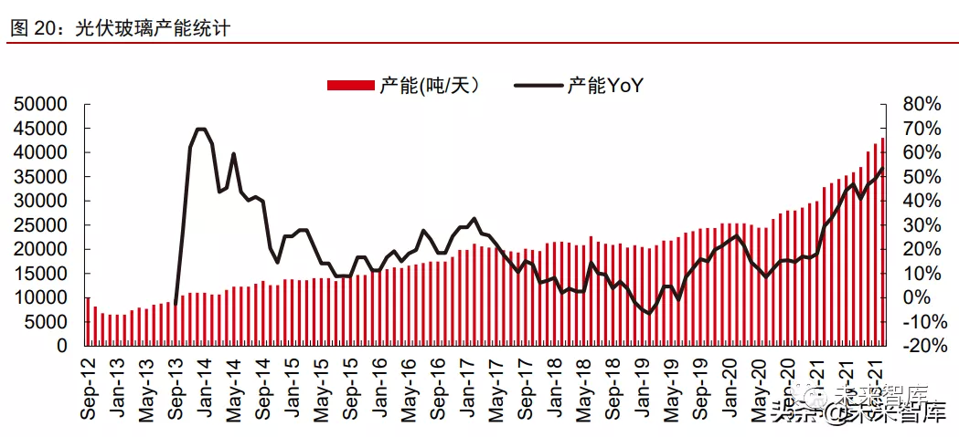 光伏玻璃产能迎来加速投放。由于光伏玻璃产能置换政策限制放宽,以及“双碳”目 标下光伏行业长期增长潜力进一步增强,2021 年以来光伏玻璃行业进入产能加速投放阶 段。截至 2021 年 10 月,国内光伏玻璃日熔化量约 4.31 万吨/天(+53.5% YoY)。