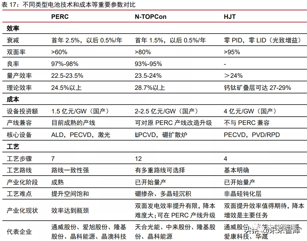 针对 PERC、TOPCon 和 HJT 这几种主流的技术路线,我们从效率、成本及工艺等 多个角度对比: