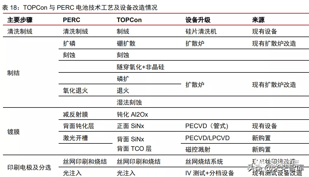 目前 PERC 电池产线单 GW 投资在 1.5-2.0 亿元,而仅需 6000-8000 万元即可改 造升级为 TOPCon 产线。在面临大规模 PERC 产线设备资产折旧计提压力下,改造为 TOPCon 拉长设备使用周期,降低沉没风险,是未来 2-3 年极具性价比的路线。(报告来源:未来智库)