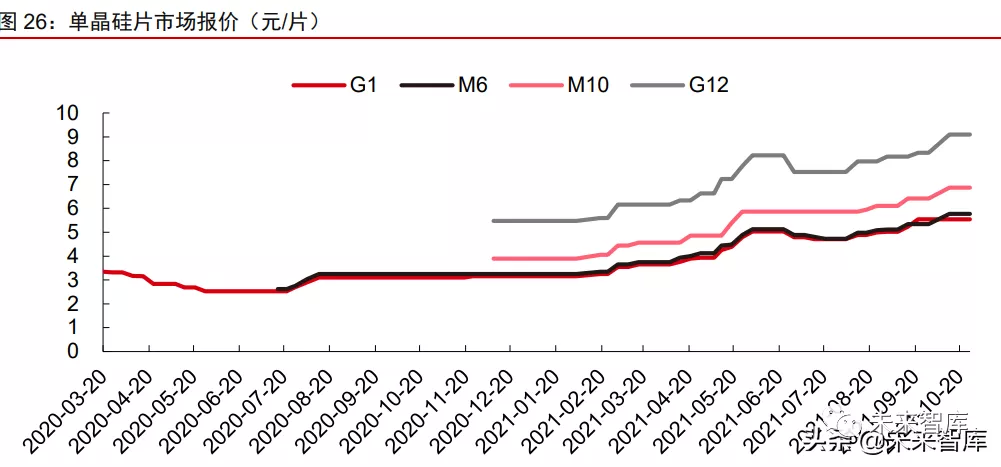单晶硅片实际产能短期受硅料供应瓶颈抑制,硅片价格跟随硅料上涨。尽管 2021 年 来单晶硅片名义产能持续快速提升,但由于硅料供给瓶颈限制,预计行业平均产能利用率 仅 6 成左右,具备供应链管控优势的头部企业开工率相对较高,行业实际有效单晶硅片产 能相对有限,供需格局处于平衡甚至略显紧张状态。因此,随着硅料价格大幅攀升,单晶 硅片价格亦持续上涨 , 目 前 G1/M6/M10/G12 硅片价格较年初涨幅已分别达 76%/78%/76%/66%。
