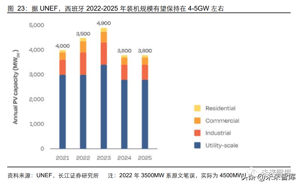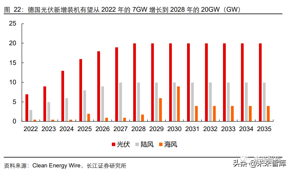 2022 年 2 月 28 日,德国气候部门提出新的立法草案,拟将 100%实现可再生能源发电 的目标提前至 2035 年,较此前目标提前 15 年。为完成此目标,该部门还提出 2035 年 前可再生能源装机规划,由各部委投票表决。其中光伏新增装机从 2022 年的 7GW 逐 步增加到 2028 年的 20GW,而后保持该水平直至 2035 年。据此计算,2021-2025 年 德国光伏装机 CAGR 将达到 32%。