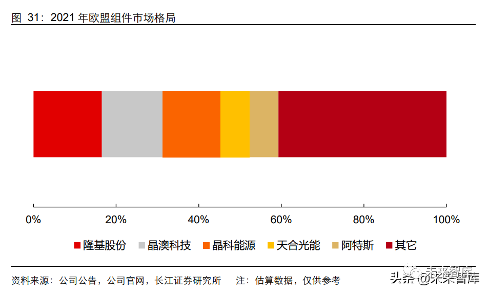 组件环节,保守估计 2021 年中国出口欧洲规模超过 40GW,同比增长超 50%2。其中, 隆基股份、晶科能源、晶澳科技、天合光能 、阿特斯等均在欧洲占据较高市场份额。按 照欧洲市场占各家一体化组件企业总出货规模的比例排序,晶澳≈晶科>阿特斯>隆基> 天合。