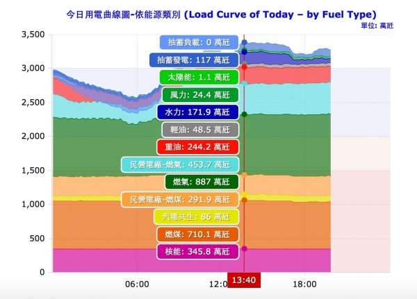 台湾地区6月1日遇到气象站设站以来的百年高温,台北市高温达摄氏38.7度,供电曲线拉出警报,备转容量仅有1.5%。但在这一天,全台新能源瞬时发电量一度以估计值3,490,000kW超过同时间核电的3,458,000kW,为台湾地区能源史上首例。 6月1日当天,台湾地区用电尖峰落在下午1点44分;而在稍早的1点40分,风力