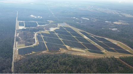 图1:美国乔治亚电力在美国陆军本宁堡基地内建设的30MW光伏电站。在81万m2的用地上设置了13万4000张太阳能电池板。(摄影:乔治亚电力)