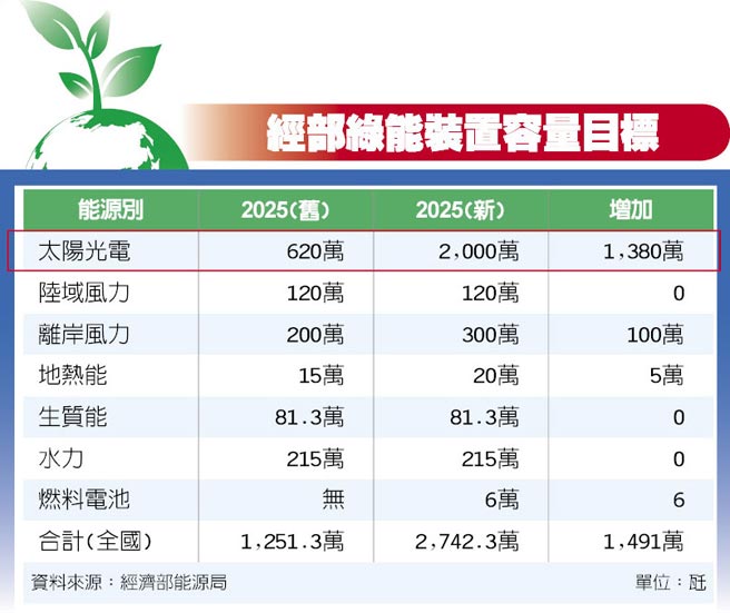 台“经济部”昨(22)日发布最新绿能目标,全面将蔡英文“总统”的再生能源目标纳入,太阳光电装置量比“旧政府”规划多2倍、离岸风力多5成,2025年总再生能源目标达到2,742万千瓦。初估光太阳能与离岸风力总投资额金额就达1.74兆元,带动商机庞大。