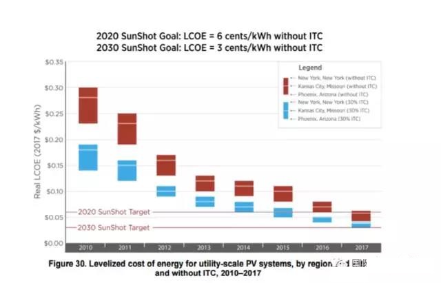 这样,美国公共事业级光伏电站已经基本实现能源部2011年为2020年设定的成本下行目标(Sunshot Goal):度电平准成本6美分/千瓦时、系统投资成本1美元/瓦。