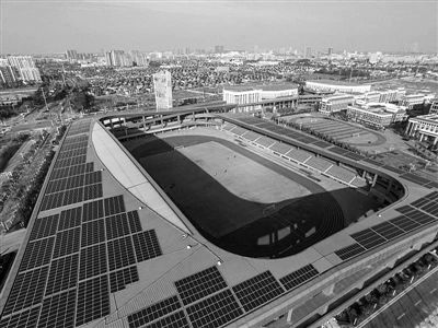 在江苏扬中,无论是企业、居民还是政府单位,各类场所的屋顶上,太阳能电池板的身影随处可见。2016年,该市万元GDP能耗0.3257吨标准煤,仅为江苏省平均值的一半左右,二氧化碳排放量、主要污染物排放强度均低于全省平均水平。扬中奥体中心屋顶光伏发电项目在扬中,绿色能源企业多达近百家,其中光伏及配套企业就有近50家。图为江