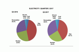 与2016年第三季度相比,可再生能源的份额增加了4.6个百分点,反映了容量和可用性的增加以及总体发电量的下降。气候条件对行业发展造成了些许不利影响,特别是较低的风速。