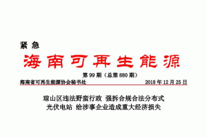 在全省认真学习贯彻习近平413重要讲话和中央12号文件,大力营造良好营商环境,建设服务型政府,保护和发展民营经济,推进海南自贸区(港)建设的今天,发生在甲子镇的这起严重违法强制行政事件令人震惊。海南省可再生能源协会强烈吁请海南省相关部门尽快组成专案组展开调查,搞清事实真相,评估企业的损失,厘清琼山区相关部门和责任人的责任,严肃追究有关责任单位、责任人的经济和法律责任,以维护企业的正当合法权益,给涉事企业和社会公众一个明确、公正的交代。