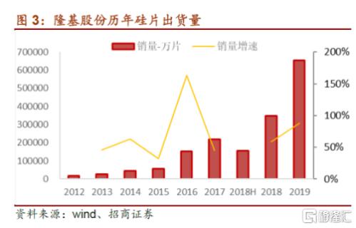 截至2019年底,隆基股份的单晶硅片产能达到42GW,单晶组件产能达到14GW,超预期完成了产能规划目标;报告期内,单晶硅片产量为647746.28万片,同比增长77.83%,单晶组件产量8906.36MW,同比增长24.11%。