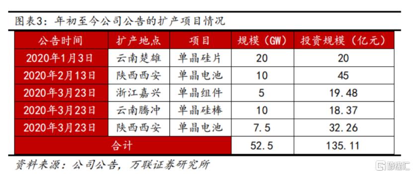 根据光伏行业协会统计,2019年硅片产量130GW,其中单晶90GW,多晶45GW,根据PV InfoLink预测,2019年单晶市场份额占比将上升至62%左右,到2021年将进一步提升至85%以上,隆基单晶硅在整个光伏硅片市场的占有率仅27%,所以抢占市场成为隆基当下最重要的决策。在2020年扩产规划已达52.5GW,投资规模高达135.11亿元。