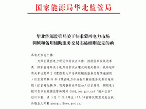 国家能源局华北监管局官网消息:为深化蒙西电力现货市场试点工作,按照国家发展改革委、国家能源局关于电力现货试点建设的有关要求,华北能监局组织有关单位起草了《蒙西电力市场调频辅助服务交易实施细则(征求意见稿)》和《蒙西电力市场备用辅助服务交易实施细则(征求意见稿)》,现向各相关单位公开征求意见,细则电子版可在华北能源监管局网站(hbj.nea.gov.cn)“通知公告”栏目下载。请 5月15日(周五)17:00前将反馈意见发至我局联系人邮箱guangrui@nea.gov.cn。