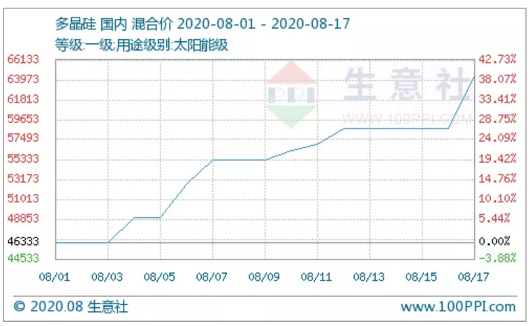 据生意社监测,进入8月份以来,受供应紧张以及下游硅片厂家采购量放大等因素影响,多晶硅价格持续上行。截止8月17日,多晶硅涨幅达38.85%。目前,多晶硅太阳能级一级料国内市场报价已经达到60000-65000元/吨的价格区间,进口料价格也达到65000-70000元/吨区间。