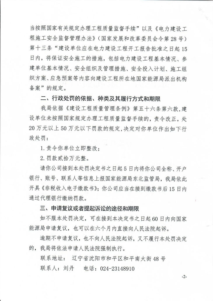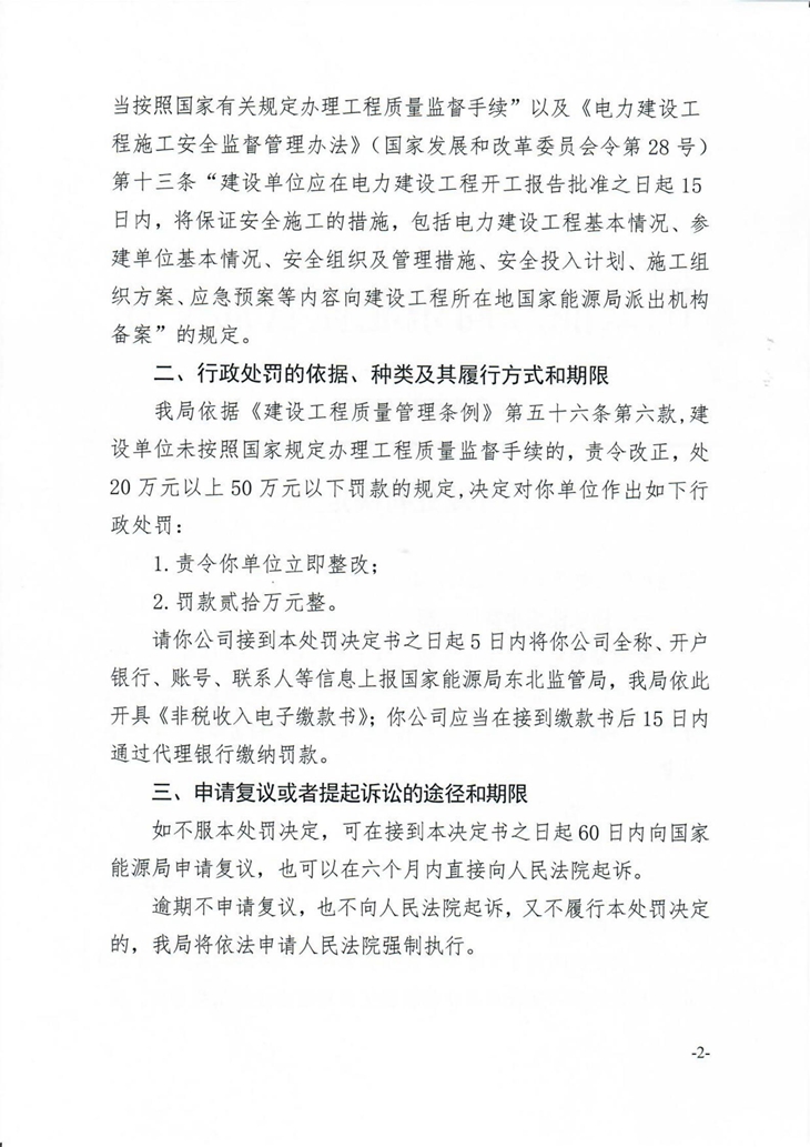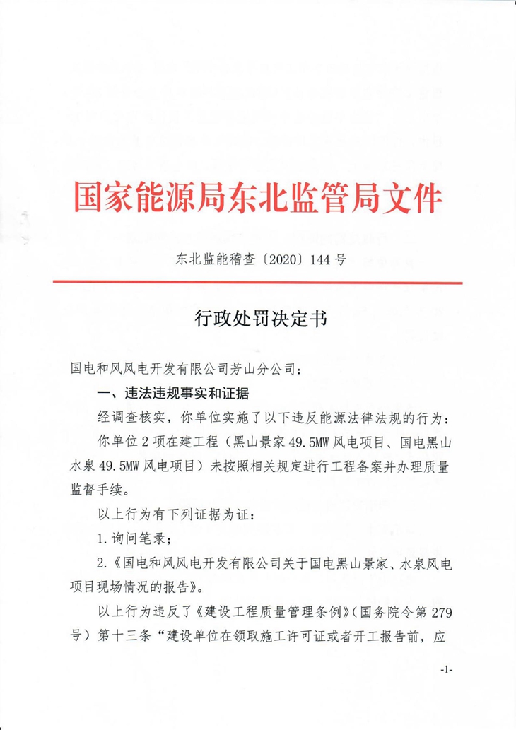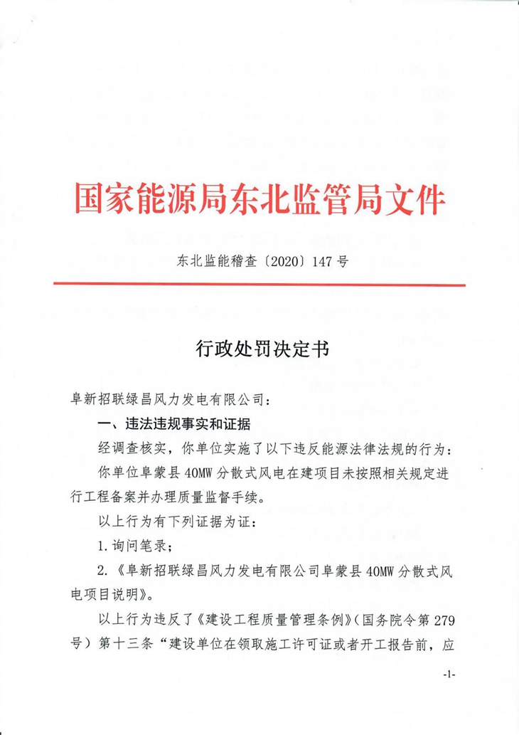 近日,国家能源局东北监管局相继发布四条行政处罚决定书,对违反能源法律法规的4家能源企业给予行政处罚,责令立即整改。分别为:大连东方国顺能源科技有限公司,大连市普兰店区乐甲街道网源友好型风电场示范项目;阜新市绿色丝路售电有限公司,阜蒙县50MW分散式风电在建项目;阜新招联绿昌风力发电有限公司,阜蒙40MW分