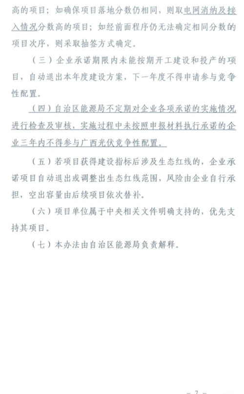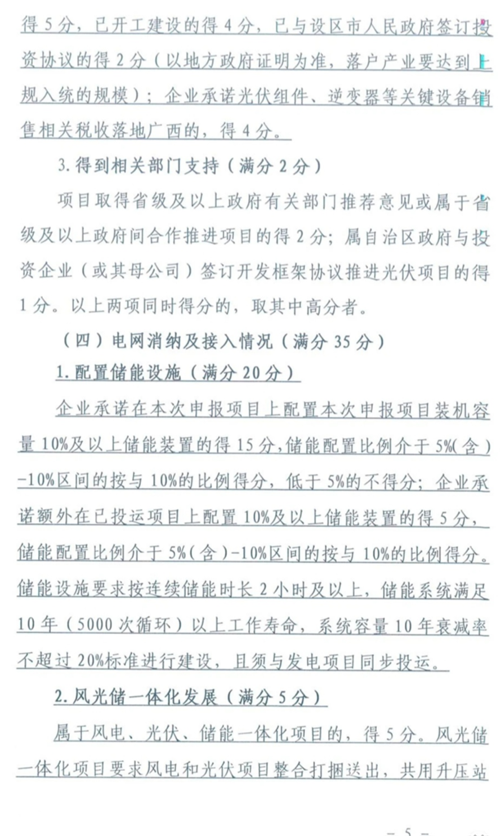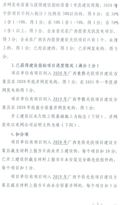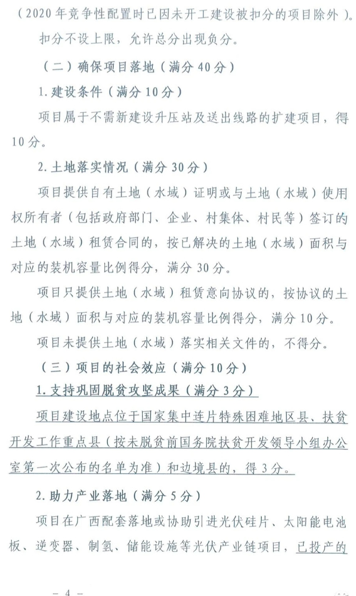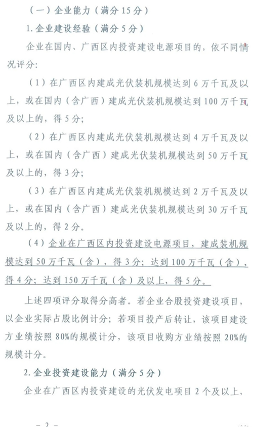 日前,广西能源局印发《关于征求2021年度平价风电、光伏项目竞争性配置办法有关意见的函》,文件明确,平价光伏项目竞争性配置评分方案主要体现四个原则:一是选择投资实力强的企业,二是确保项目落地,三是对占用指标为建设的项目单位给予一定惩罚,四是电网接入和消纳条件好。评分办法提出,从企业持有项目规模、备案与并网项目占比、设备先