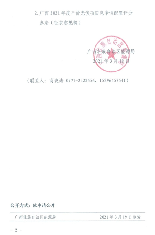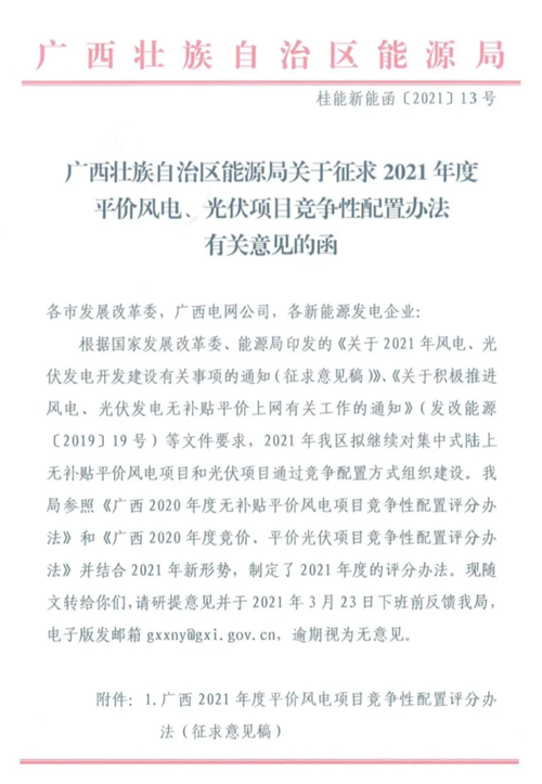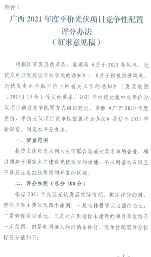 日前,广西能源局印发《关于征求2021年度平价风电、光伏项目竞争性配置办法有关意见的函》,文件明确,平价光伏项目竞争性配置评分方案主要体现四个原则:一是选择投资实力强的企业,二是确保项目落地,三是对占用指标为建设的项目单位给予一定惩罚,四是电网接入和消纳条件好。