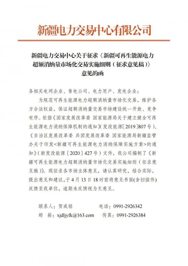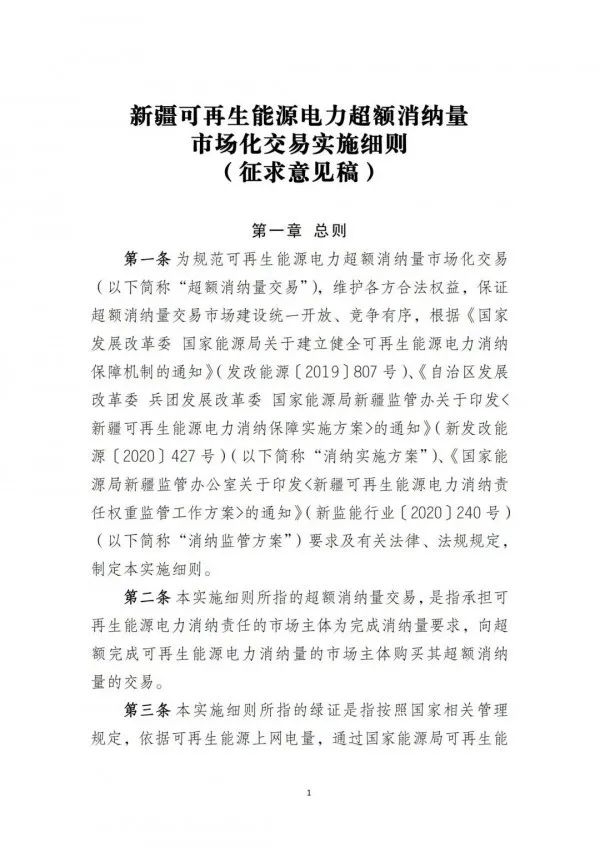 日前,新疆电力交易中心印发关于征求《新疆可再生能源电力超额消纳量市场化交易实施细则(征求意见稿)》,全文如下: