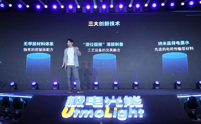 发布会现场,极电光能联合创始人兼副总经理郑策博士首次对外发布了钙钛矿太阳能组件“极创”整体解决方案,推出无甲胺钙钛矿材料体系、“原位固膜”薄膜制备技术和纳米晶导电墨水三大技术创新,从材料制作、技术应用、配方改进等维度打造核心技术优势,逐个攻破钙钛矿产业在效率提升、大面积制备以及稳定性方面的行业痛点,为钙钛矿商业化量产扫清障碍。