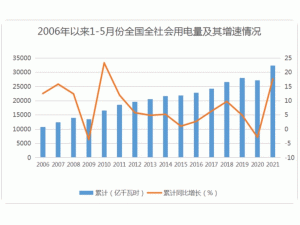 1-5月,全社会用电量累计32305亿千瓦时,同比增长17.7%。分产业看,第一产业用电量362亿千瓦时,同比增长21.6%;第二产业用电量21779亿千瓦时,同比增长18.6%;第三产业用电量5483亿千瓦时,同比增长27.8%;城乡居民生活用电量4681亿千瓦时,同比增长4.1%。