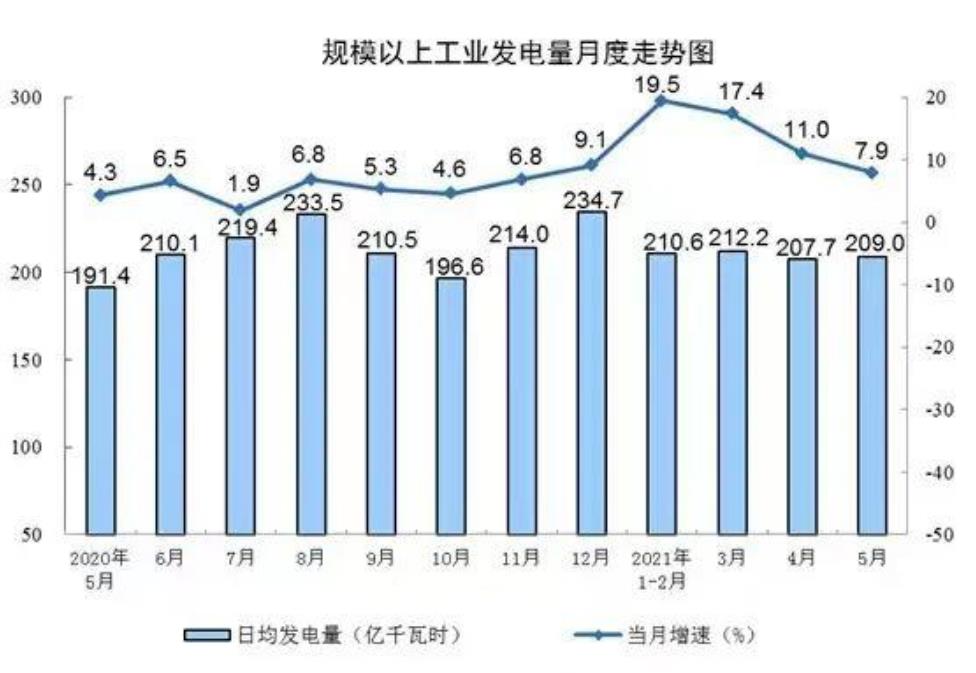 电力生产增速有所回落。5月份,发电6478亿千瓦时,同比增长7.9%,比2019年同期增长12.6%,两年平均增长6.1%,日均发电209亿千瓦时。1—5月份,发电31772亿千瓦时,同比增长14.9%,比2019年同期增长11.3%,两年平均增长5.5%。