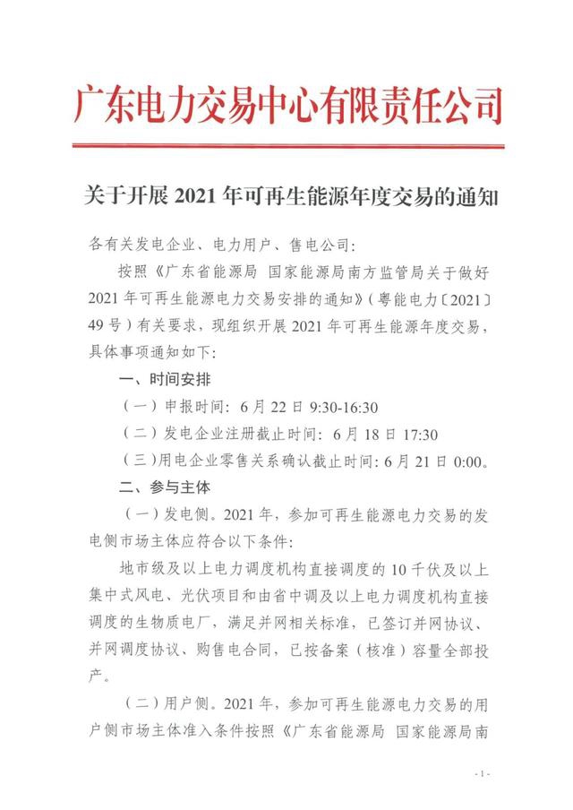 日前,广东电力交易中心发布关于开展2021年可再生能源年度交易的通知,6月只开展可再生能源年度交易,不开展可再生能源7月月度交易。申报时间为6月22日。