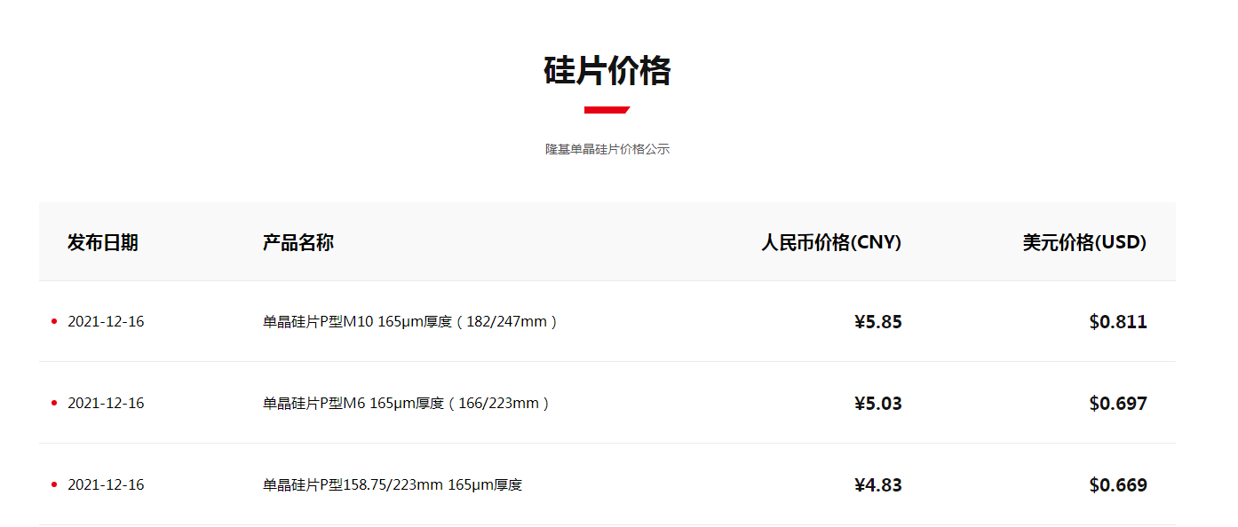 12月16日,隆基股份官网发布了单晶硅片最新报价。对于165μm厚度的P型单晶硅片,M10尺寸由6.20元下调到5.85元,下调幅度5.7%;M6尺寸由5.32下调到5.03元,下调幅度5.5%;G1尺寸由5.12元下调到4.83元,下调幅度5.7%。