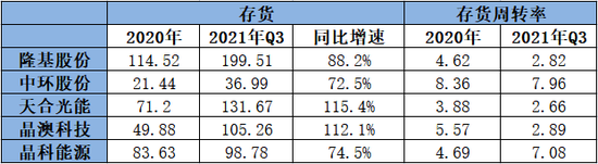 以光伏板块龙头隆基股份为例,根据公司2021年第三季度情况,公司目前存货价值高达199.51亿元,其中以光伏组件为主。同时隆基的存货周转率也大幅下降,相比2020年4.62倍,2021年Q3仅有2.82倍;另一光伏龙头中环股份的存货周转率也明显下降;其他光伏组件头部公司,如晶澳科技和天合光能的存货也大幅增加,分别同比增长112.09%和115.36%,而且存货周转率都呈现明显下降趋势。