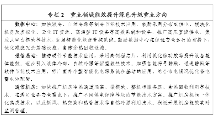 一是大力提升重点行业领域能效。加强重点行业能量系统优化、余热余压利用、可再生能源利用、公辅设施改造等。持续开展国家绿色数据中心建设,提高网络设备等信息处理设备能效。推进跨产业跨领域耦合提效协同升级。