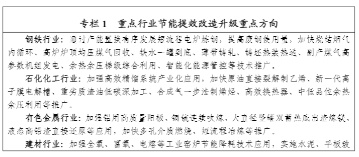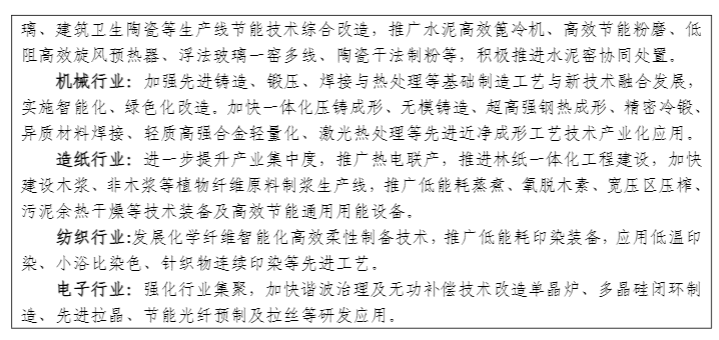 (一)推进重点行业节能提效改造升级。深入挖掘钢铁、石化化工、有色金属、建材等行业节能潜力,有序推进技术工艺升级,推动能效水平应提尽提,实现行业能效稳步提升。针对机械、造纸、纺织、电子等行业主要用能环节和设备,推广一批关键共性节能提效技术装备,加快提升行业能效。鼓励企业加强能量系统优化、余热余压利用、可再生能源利用、公辅设施改造等。