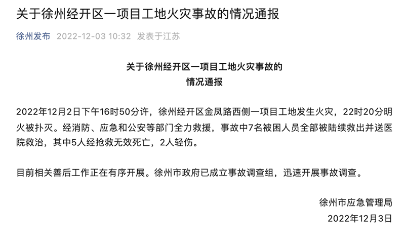 12月3日,徐州市应急管理局通过“徐州发布”发布情况通报称,12月2日下午16时50分许,徐州经开区金凤路西侧一项目工地发生火灾,22时20分明火被扑灭。经消防、应急和公安等部门全力救援,事故中7名被困人员全部被陆续救出并送医院救治,其中5人经抢救无效死亡,2人轻伤。