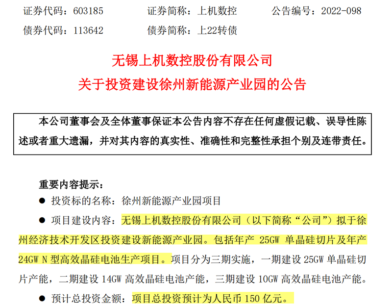 上机数控表示,公司自2019年开始投资建设光伏单晶硅业务,产能持续扩建,根据公司的战略发展需要,公司计划在原有单晶硅业务规模的基础上,进一步扩大单晶硅切片产能并延伸新的产业链,建设N型高效晶硅电池生产项目。