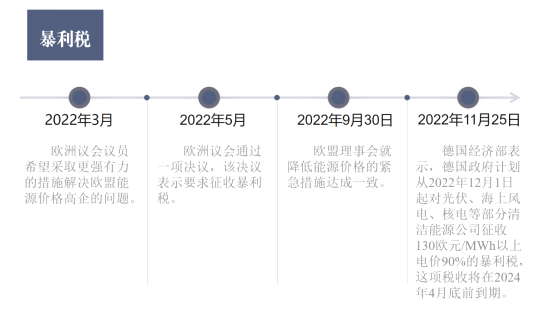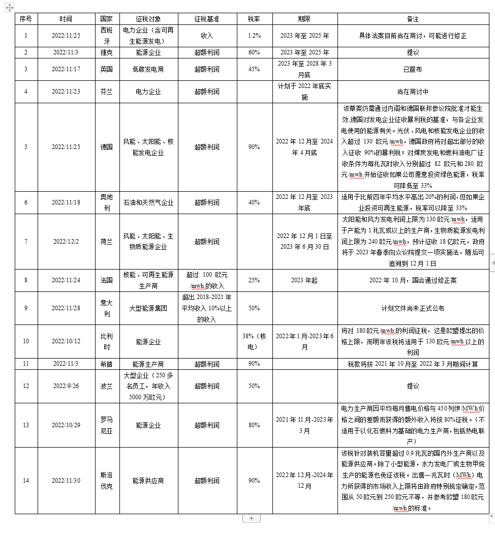 欧盟理事会就降低能源价格的紧急措施达成一致后,德国、奥地利、罗马尼亚等国家率先开始实施暴利税征收政策,其中,德国将于2022年12月起对风能、太阳能、核能发电企业的超额利润征收高达90%的暴利税。