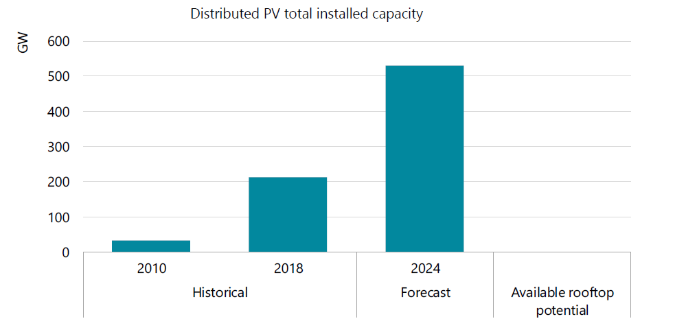 随着政策不断完善、成本不断下降、应用范围不断扩大,分布式光伏的总装机量到2024年将翻倍。然而,从技术层面来讲,这将仅仅在全球分布式光伏发展潜力中占据6%。