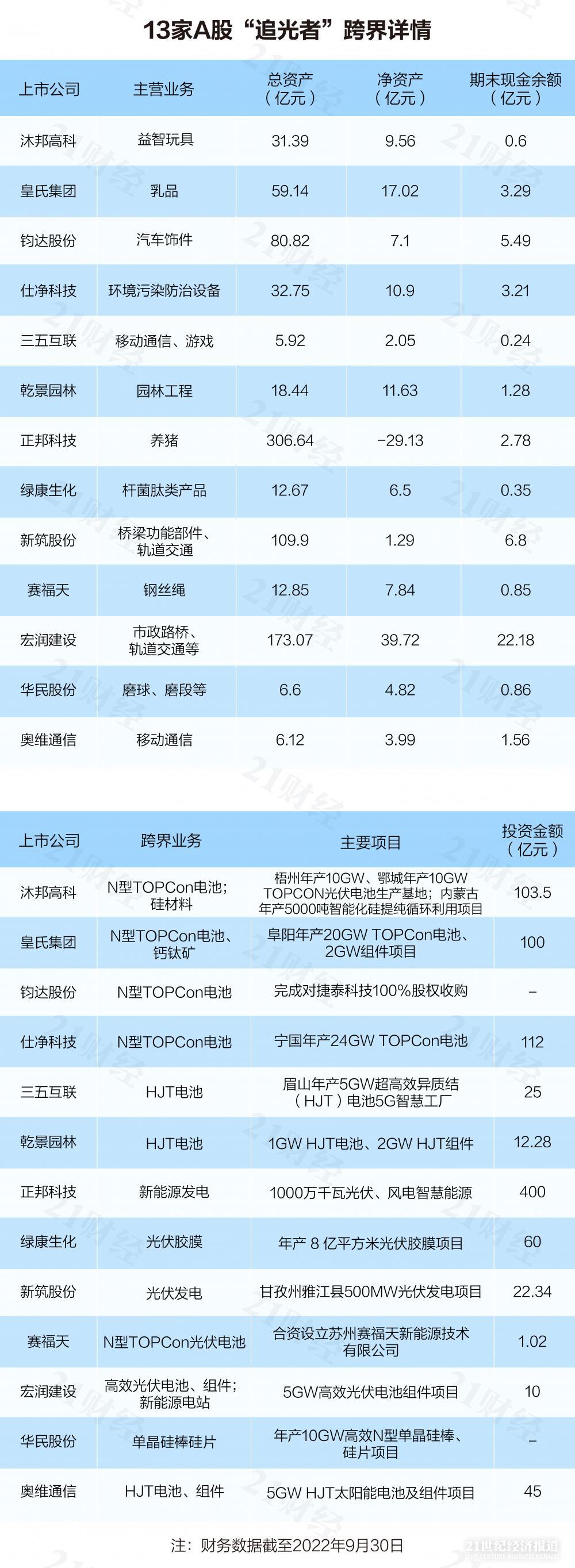 13家A股公司跨界光伏详情 数据来源:公司公告、21世纪经济报道记者整理